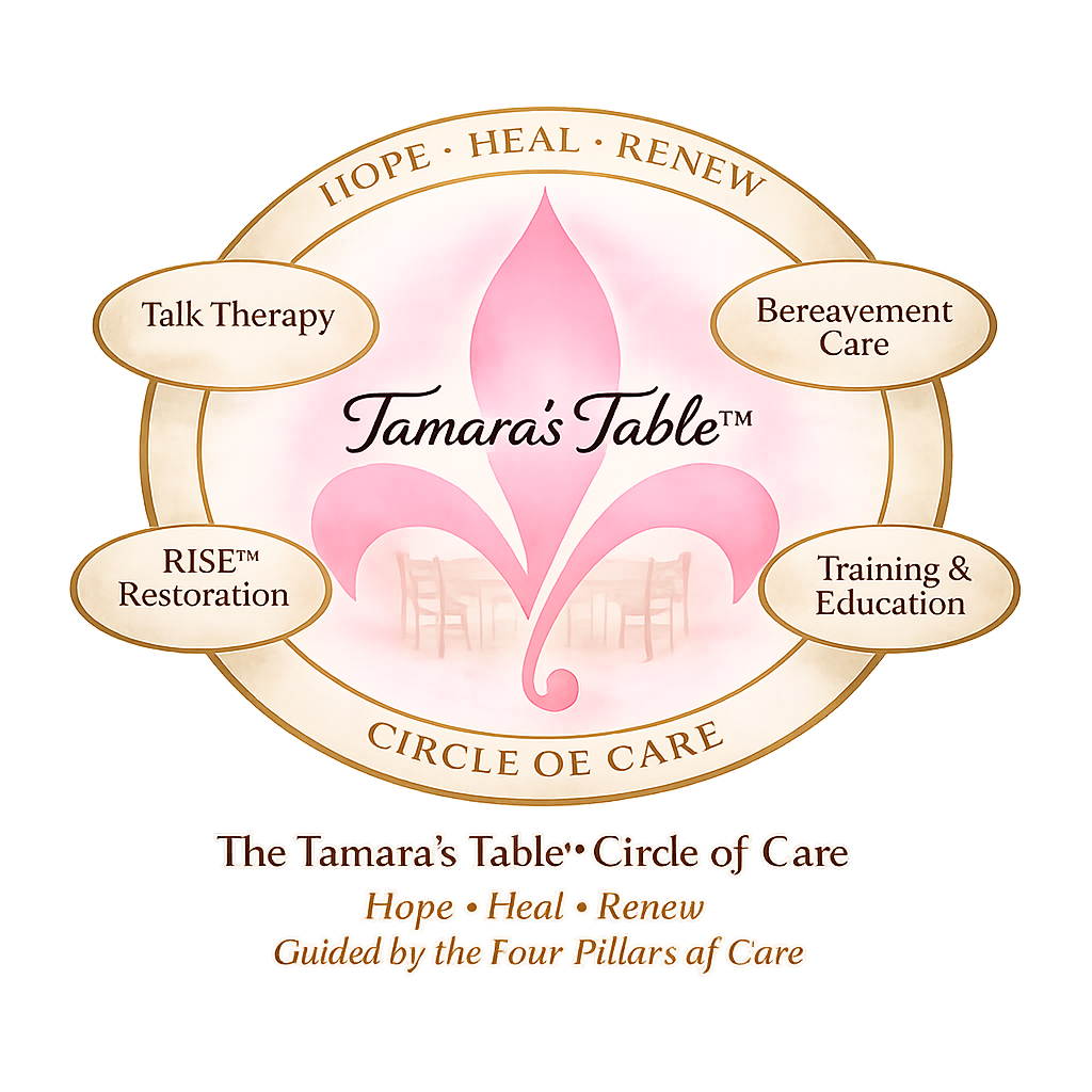 Tamara’s Table™ operates as an independent counseling ministry under Tamara’s Table, L.L.C. Within this counseling practice, Tamara’s Table Bereavement Care Program and RISE™~A Table of Hope serve individuals navigating trauma, grief, loss, and bereavement, providing compassionate, faith-centered support during some of life’s most difficult seasons.